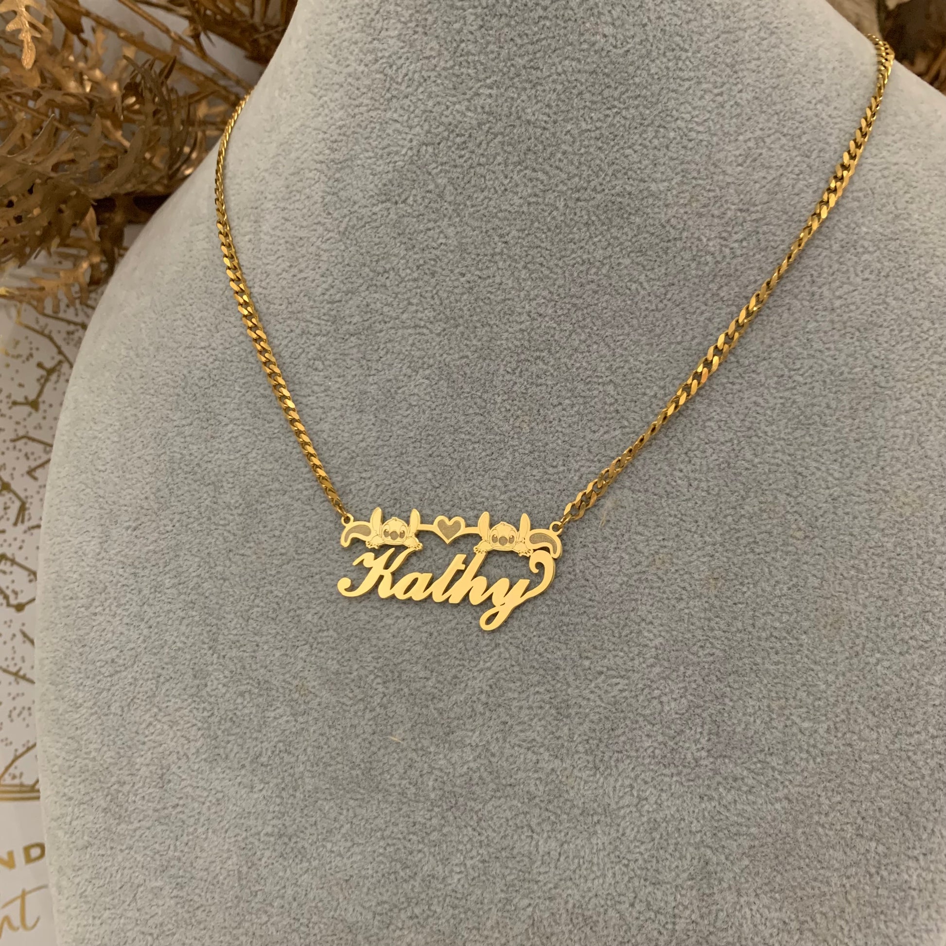 Add a playful, personalized touch to your jewelry collection with this Custom Stitch Nameplate Necklace. Featuring two adorable Stitch engravings on either side of a heart, this necklace is customized with your chosen name in elegant script, making it a one-of-a-kind piece that’s perfect for gifting or treating yourself.